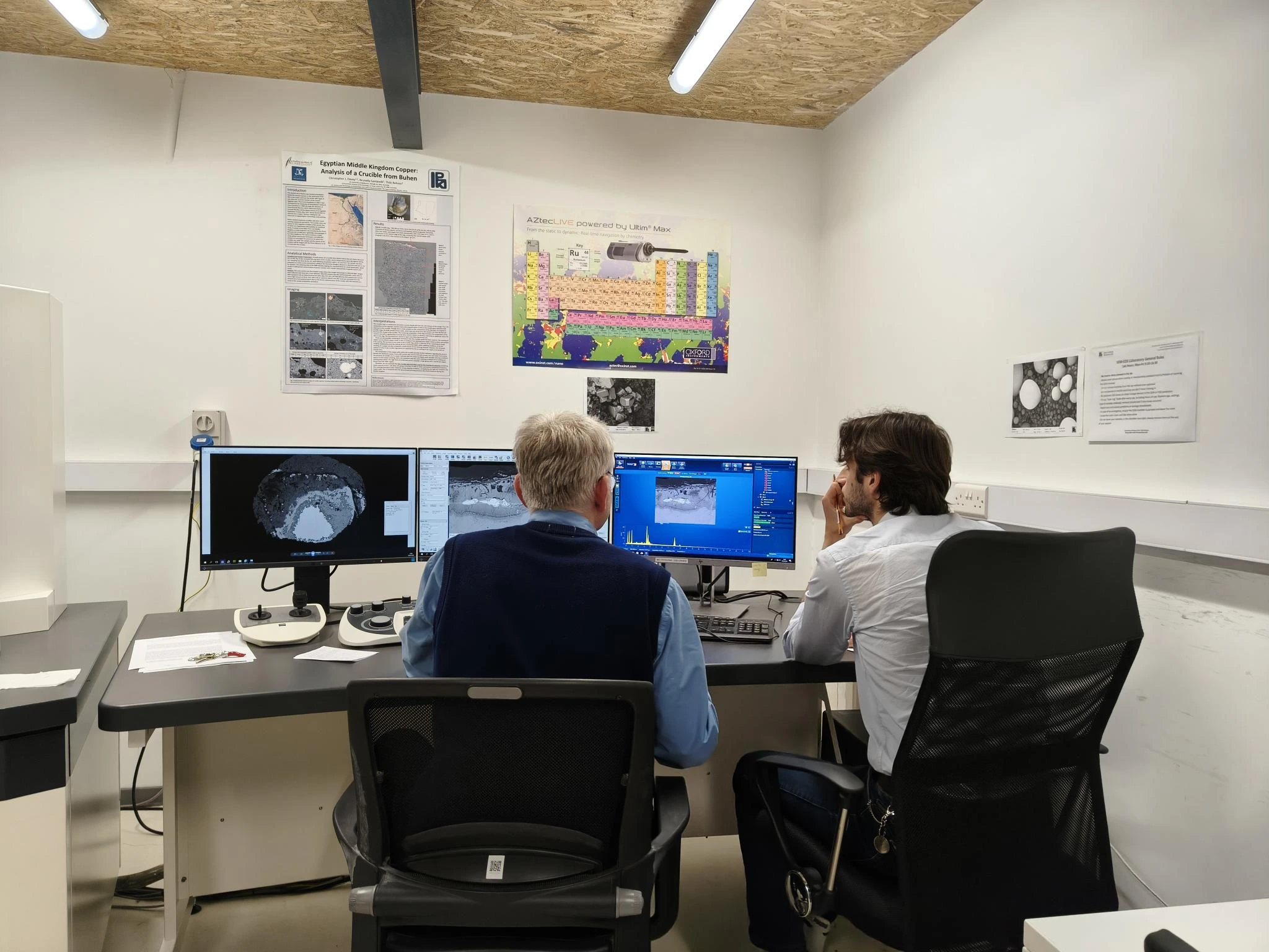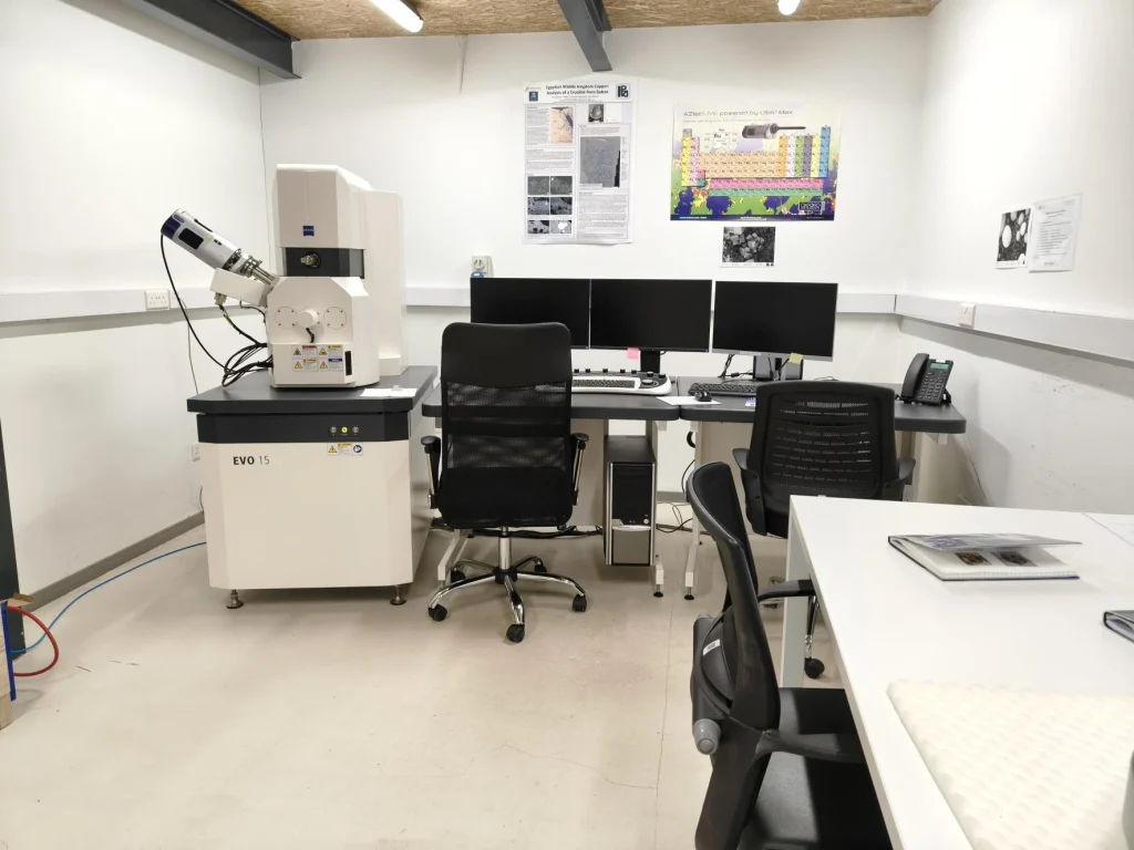 Central facilities include the Zeiss EVO 15 Scanning Electron Microscope with Oxford Instruments Maxxim Energy-Dispersive Spectrometer (SEM-EDS), the Zeiss AxioImager M3 polarising light microscope, and a dedicated petrography microscope for ceramic thin-section studies acquired through the MSCA-DN PlaCe project. These are supported by multiple stereomicroscopes (some with dual viewing and digital cameras), digital imaging systems, and sample-preparation equipment, including geological sieves, a flotation device, a Rotofix 32A centrifuge, a Lab Companion PMH-720 fume hood, and a Faithful GP 45BE oven/incubator.